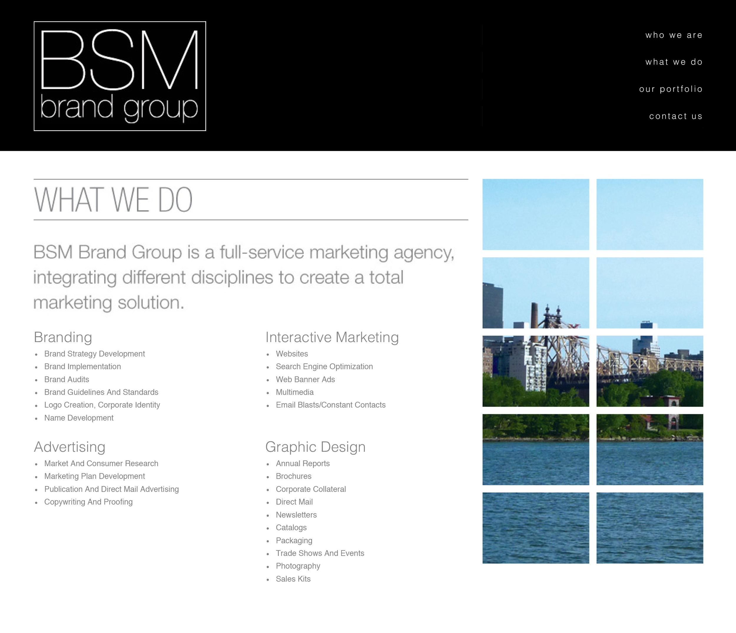 I designed, developed, and art directed this website for BSM Brand Group. This also included building the brand for the firm, designing a logo and choosing fonts and colors that best displayed the sophisticated and professional approach this small firm wanted to display.